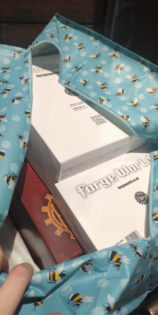 I don’t drive and I live in Scotland, so it was a 4 hour train ride down and a 4 hour train ride back up. On my way to Warhammer World I stopped in Dunelm (Its at the dram stop before WW) and got an xl carrier bag and prayed it was big enough for the titan.